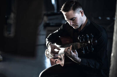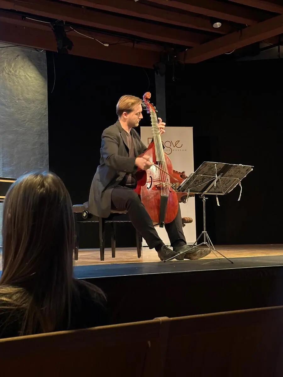André Lislevatn spiller viola da gamba i Ringves konsertsal. Fra Baraokkfests første lunsjkonsert i 2023. Foto: Ringve Musikkmuseum