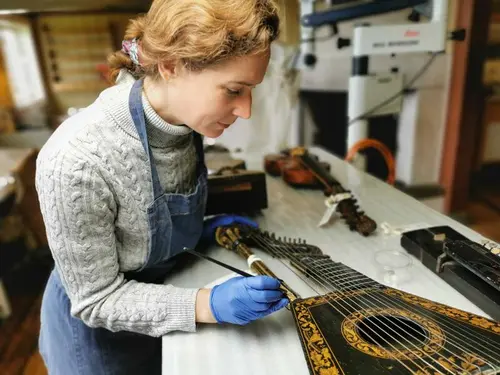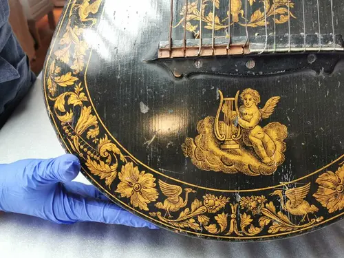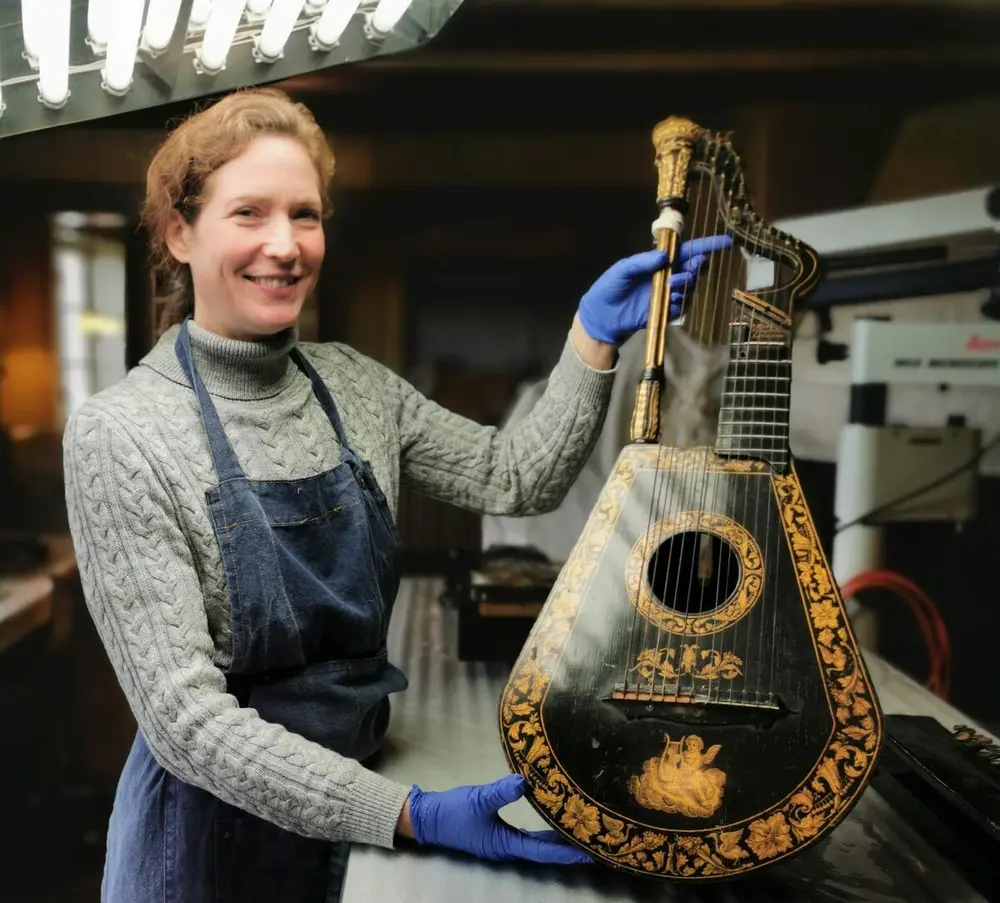 Materialkonservator Vera de Bruyn-Ouboter arbeider med en engelsk harpelutt fra 1810.