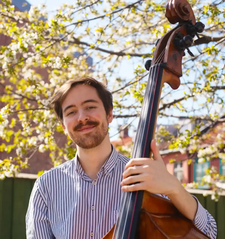 KONTRABASS: Bendik viser oss at kontra- bassen gjerne kan stå alene som soloinstrument. Her demonstrerer han hvordan han kan stemme instrumentet for å endre lydbildet og oppnå en enda større klang.