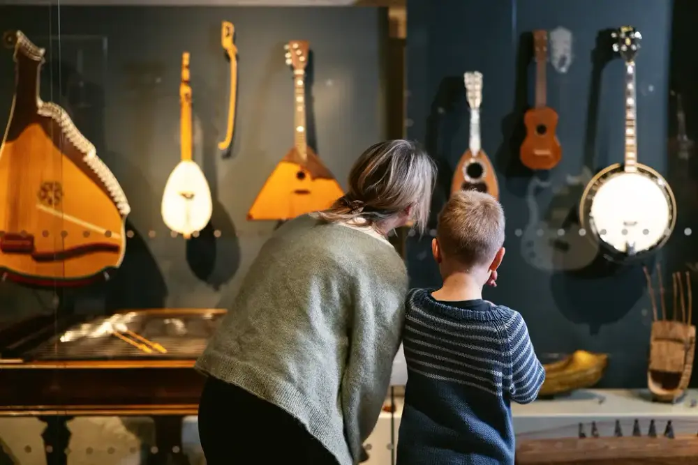 På Ringve er det over to tusen instrumenter. Vi finner fram så mange du kan telle på en hånd. Barna blir ekstra godt kjent med hvordan de høres ut, hva de er laget av, hva de likner på og hva de heter. Med ark og blyant skal vi på jakt for å finne de samme instrumentene i galleriet. Til slutt skal vi gjette lyder uten å se instrumentet.