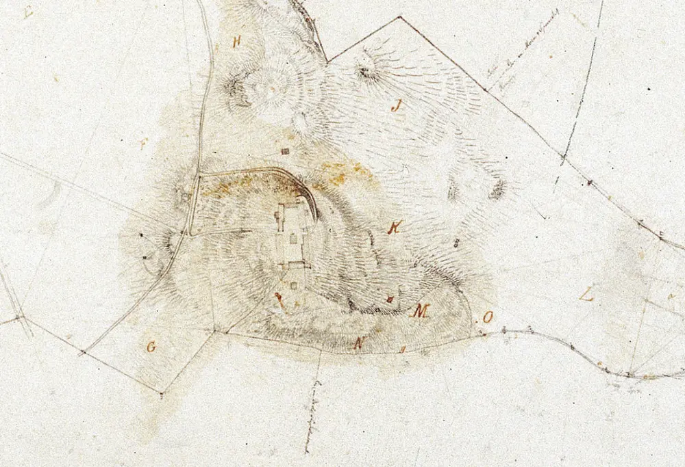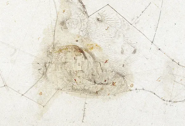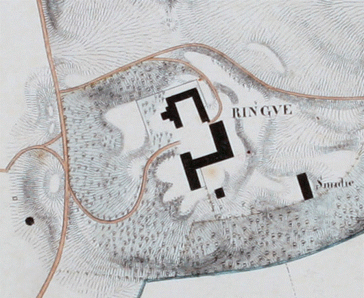Kart over Ringve, tegnet av C.A Knoff og datert 1875 (utsnitt). Her ser vi gården etter ombyggingen, med forlenget bygningskropp, utvidet havestue og to tårn. Foto: Ringve Musikkmuseum