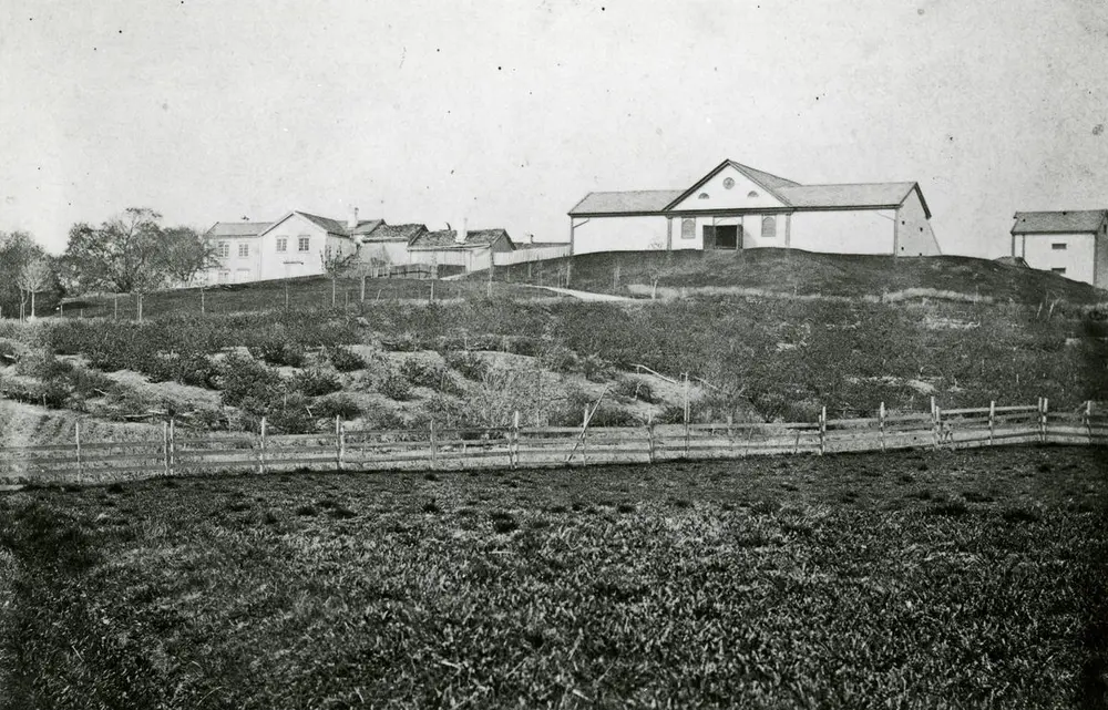 Dette bildet er tatt midt på 1860-tallet, og er det eldste fotografiet som finnes av gården. Fra venstre ser vi et stabbur, Knoffs nyoppførte driftsbygning og hovedbygningen. Foto: Marcus. W. Noodt/NTNU UB