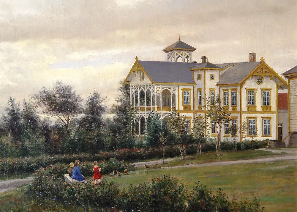 Maleri av hovedbygningen etter Herman Wedel Anker, ca. 1880. Wedel Anker var søskenbarn til Barbara Bachke. Foto: Ringve Musikkmuseum Herman Wedel Anker ca. 1880