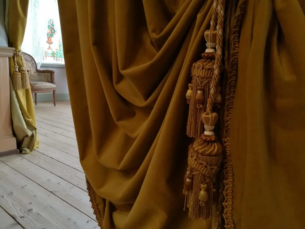 Portiérer er tykke draperte gardiner, i Havestuen i gul-grønn velur, og de ses på bildet over. Disse tunge gardinene er ment som dekor, men også for å holde trekk ute. Gardinene har possement kjøpt inn fra Tyskland.