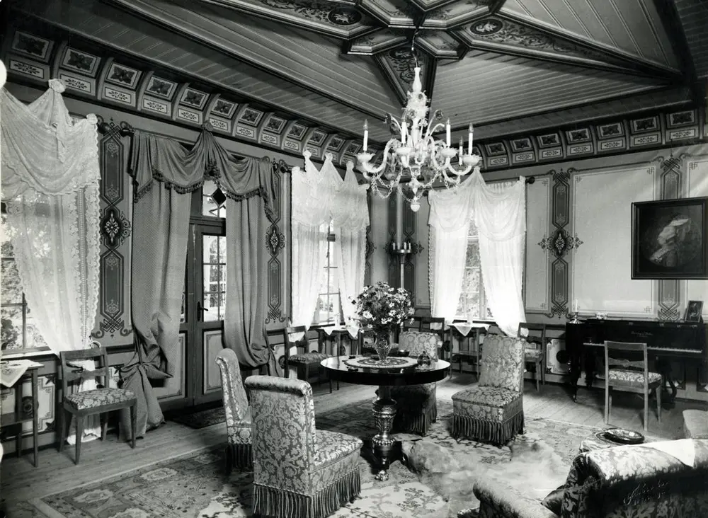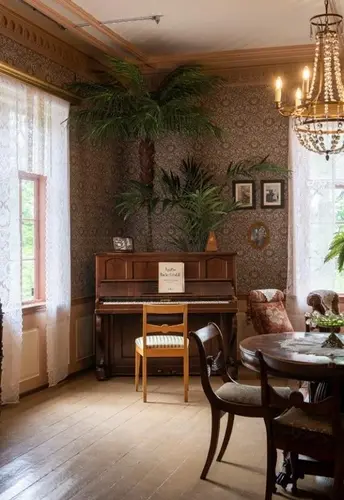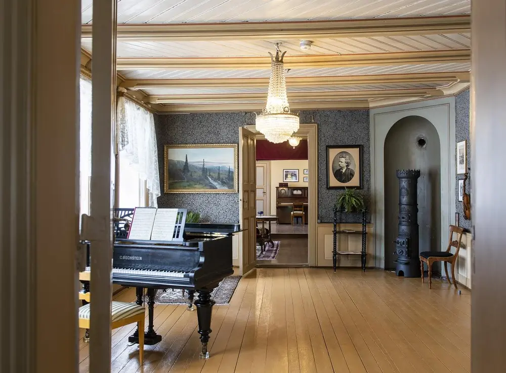 Den store palmen ruver bak pianoet i Dagligstuen. Foran vinduet til høyre står en bregne på en pidestall. Foto: Erik Børseth