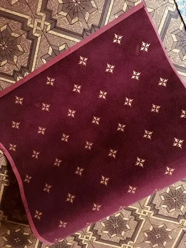Denne burgunderrøde tapeten er i Rødstuen og er en velourtapet, der korte ullfibre er limt på papiret. Stjernemønsteret er påført ved bruk av sjablonger. Dette er en kopi av det eldste tapetlaget i rommet, og både tapet og gulvbelegg må ha vært svært kostbare. Linoleumsbeleggene i Rødstuen og Barneværelset er kopier av belegg fra ca. 1890, og ble håndlaget i 2018 i Sverige på grunnlag av fragmenter fra originalene. Motivet i Rødstuen imiterer mosaikkgulv, mens det i Barneværelset imiterer eikeparkett.