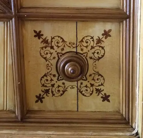 Mye av datidens dekor imiterer andre materialer, og håndverkere var eksperter på ulike dekorteknikker. Marmorering (for å etterligne steinsorter) og ådringsmaleri (for å imitere treverk) er to vanlige teknikker. I entreen er veggene dekket med ådringsmalte panelbord. Denne malingsteknikken går ut på å male inn struktur og kvister i treverket for å få det til å se ut som en annen, og gjerne mer eksklusiv, tresort. Dørene i entreen er laget i gran eller furu, men malt opp for å etterlikne bjørk og eik. Veggene imiterer eik. I taket i entreen kan man se flotte sjablongdekorasjon. Flere av rommene har slik dekor i tak, på dører og brannmurer, gjerne i kombinasjon med strekdekor eller frihåndsmaleri.