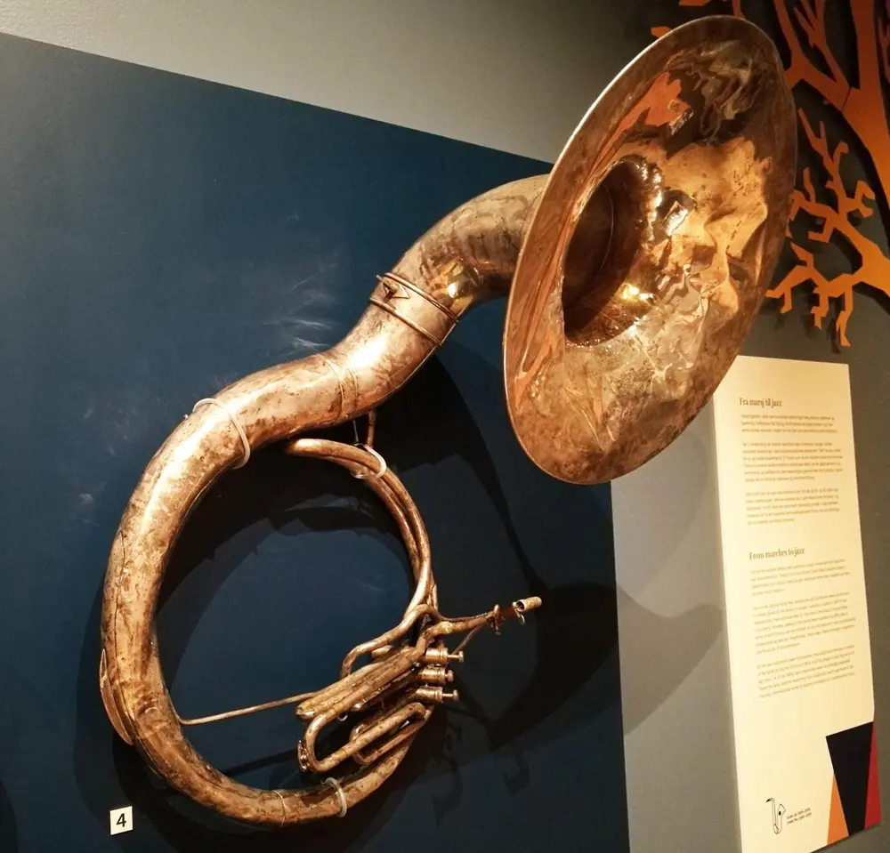 Tubaen er ferdig behandlet og henger på veggen i utstillingen Virvel og fanfare, like velbrukt og bulkete som da den ble spilt på. - 3/3