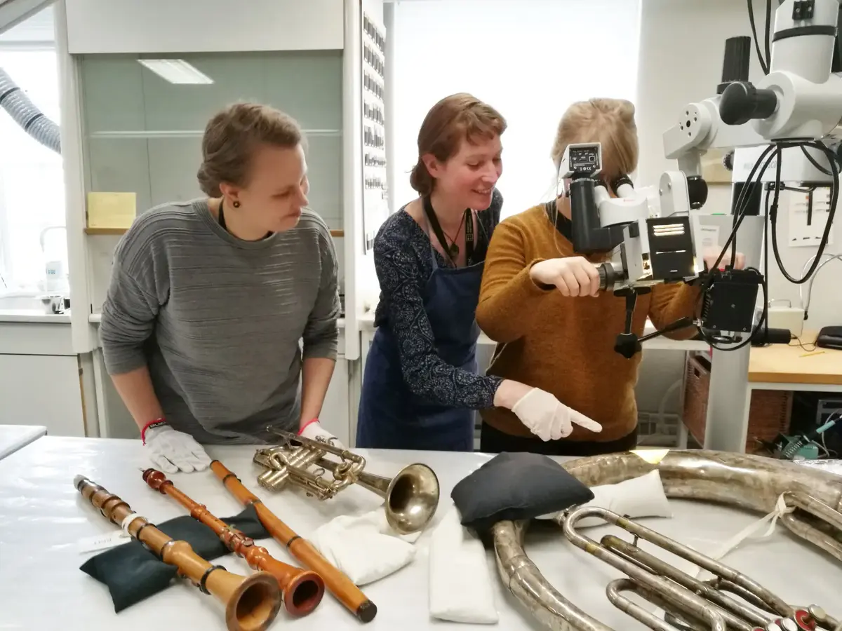 Vera de Bruyn-Ouboter (i midten) sammen med Monna Laari og Saara-Maija Pesonen. Her undersøker de metalloverflaten på ulike instrumenter for å se etter rust. Foto: Ringve Musikkmuseum
