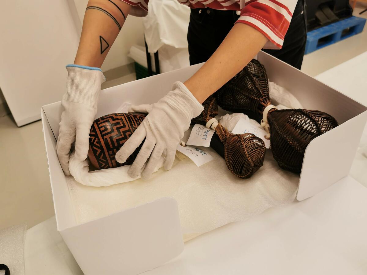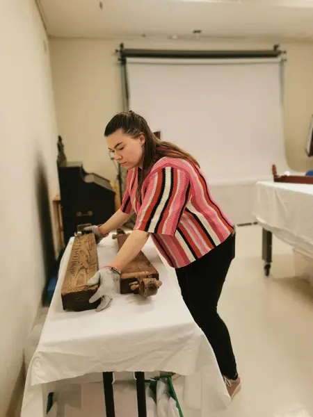 Dypt nede i kjellermagasinet til Ringve arbeider museets konservatorer og studentene med å pakke ut musikkinstrumenter som har vært lagret i magasinet på Dora. De skal registreres digitalt, pakkes forsvarlig på nytt og plasseres forsiktig med hansker og silkepapir på hyllene nede i magasinet på Ringve.