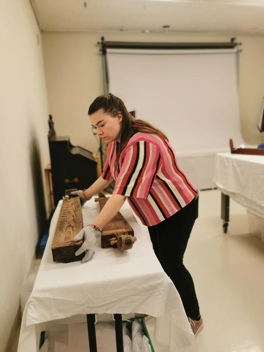 Tredjemann har en lengre praksisperiode på Ringve i høst. Maj Hauge har et fire måneders praksisopphold som avsluttende del av masteren sin i Gjenstandskonservering fra Universitetet i Oslo. – Det er verdifullt å få direkte kontakt med gjenstandene på museet, sier hun.