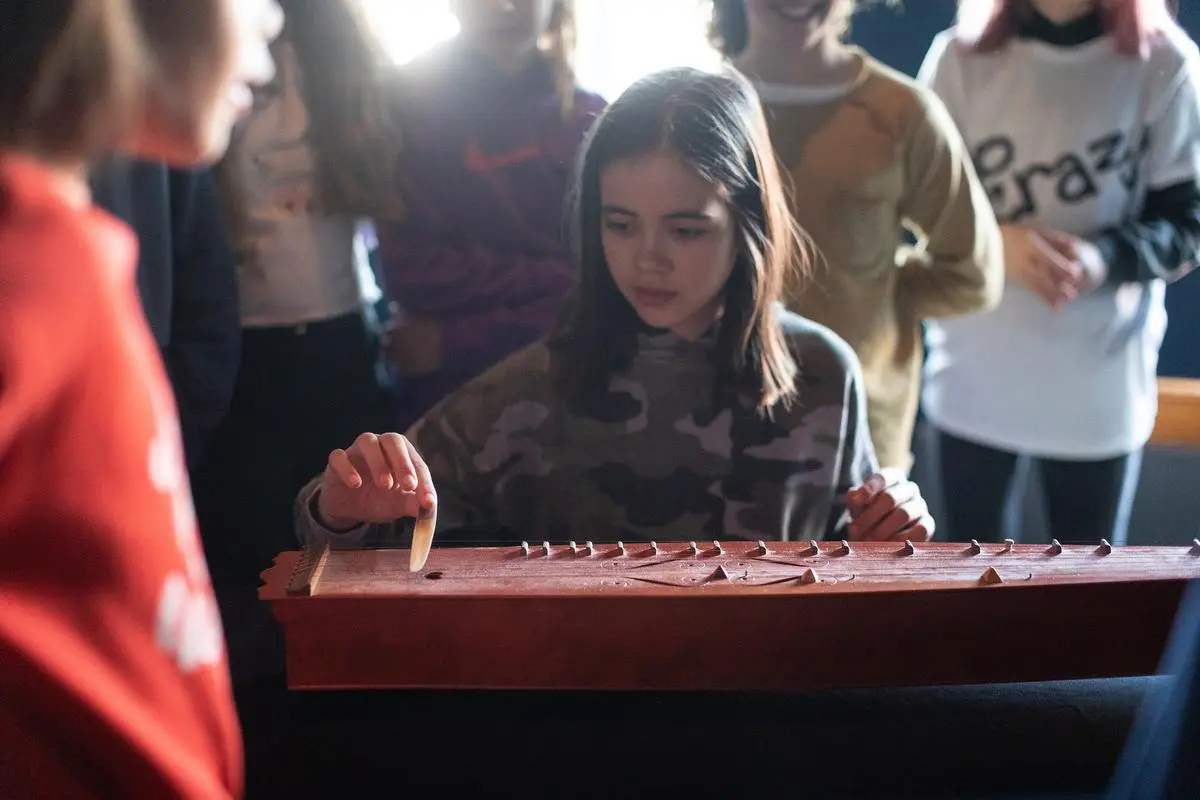 Skoleelever prøver langeleik på museet. Foto: Vidar Alvik