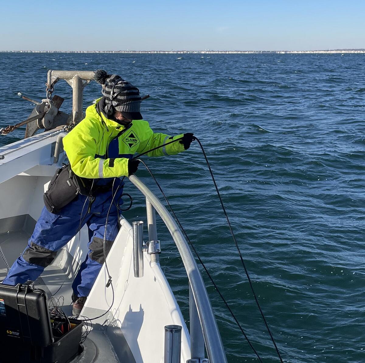 Jana Winderen gjør undervannsopptak til utstillingen The Art of Listening: Underwater ved Lenfest Center for the Arts, Colombia University, New York (2022). Foto: Gavin Browning