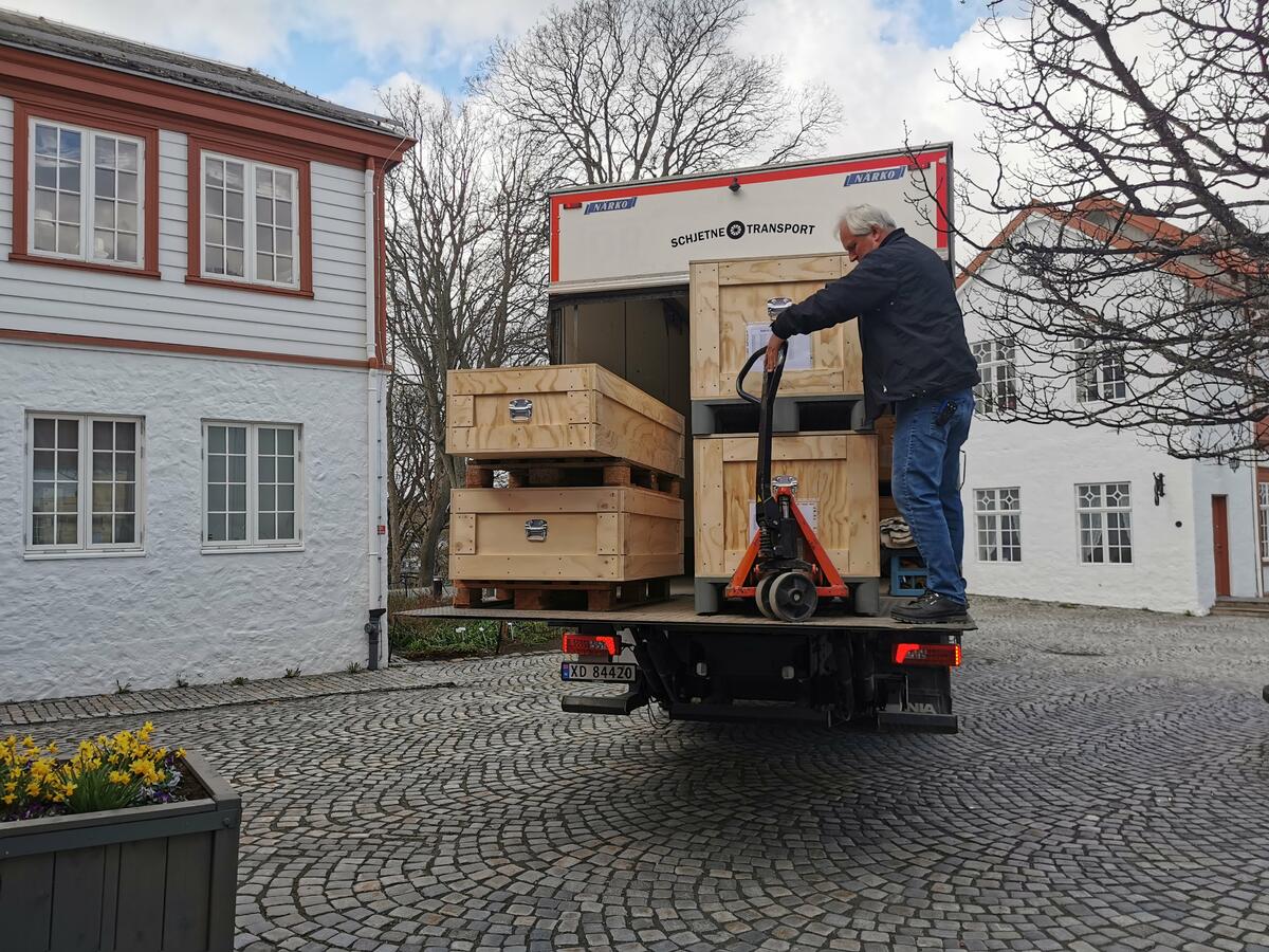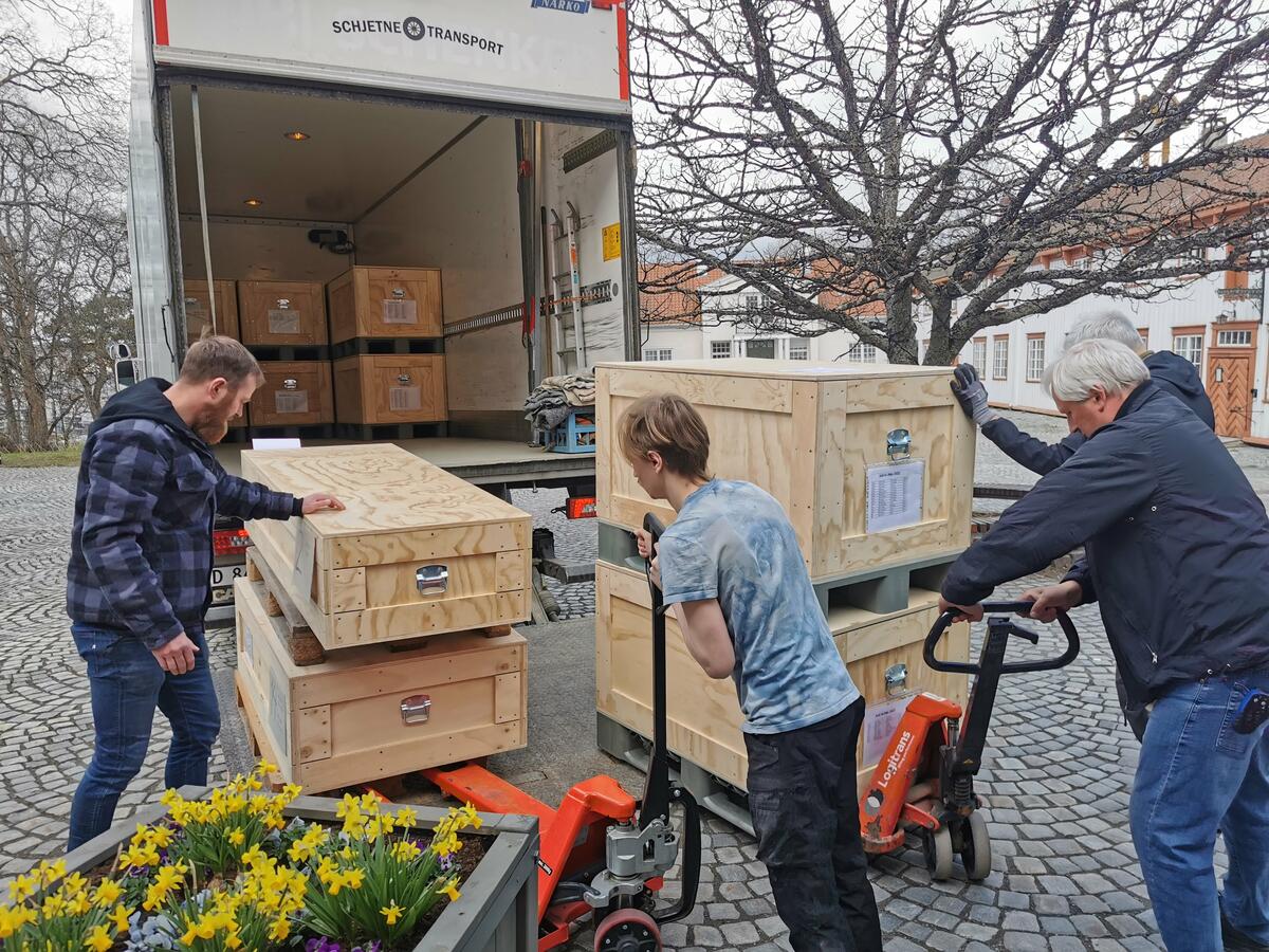 De første kassene med gitarer, virginal, lutt og fløyter fraktes inn på tunet.